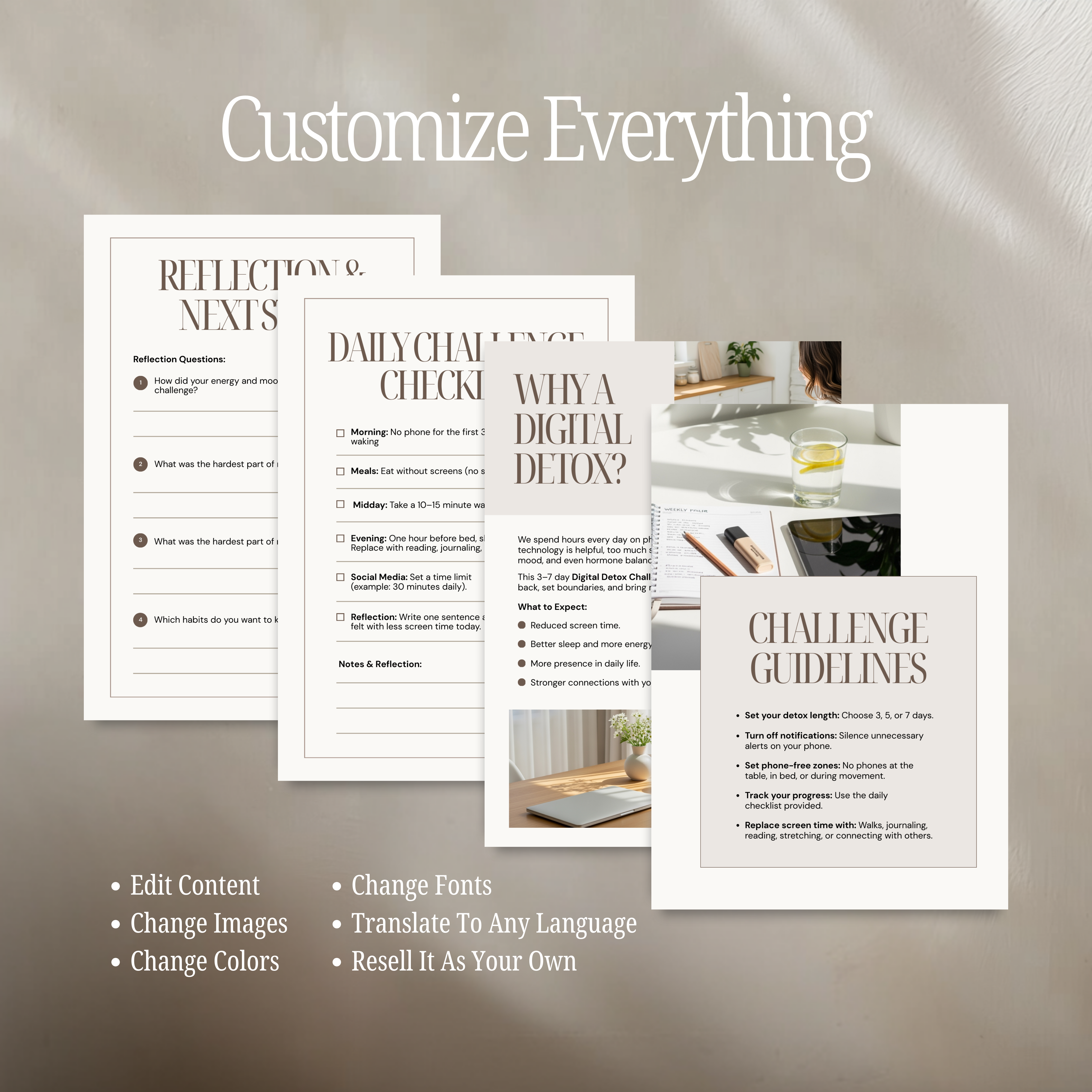 You’re allowed to use the templates to create finished products like ebooks, guides, workbooks, checklists, and resource sheets, and then resell those as long as they’re delivered as PDFs, printables, or PNGs. You can’t sell them in editable format.